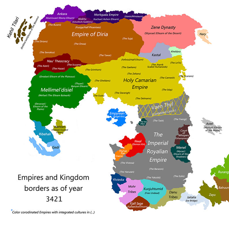 Centered on the city of Aeraanonel, the Mellimel’disiel was established in the ancient past. This iteration has had one ruling family, the Ondoleon Bloodline. Uninterested in cultures, ideas, or peoples outside of its borders, the Ellærn are a long lived species who have few children.
